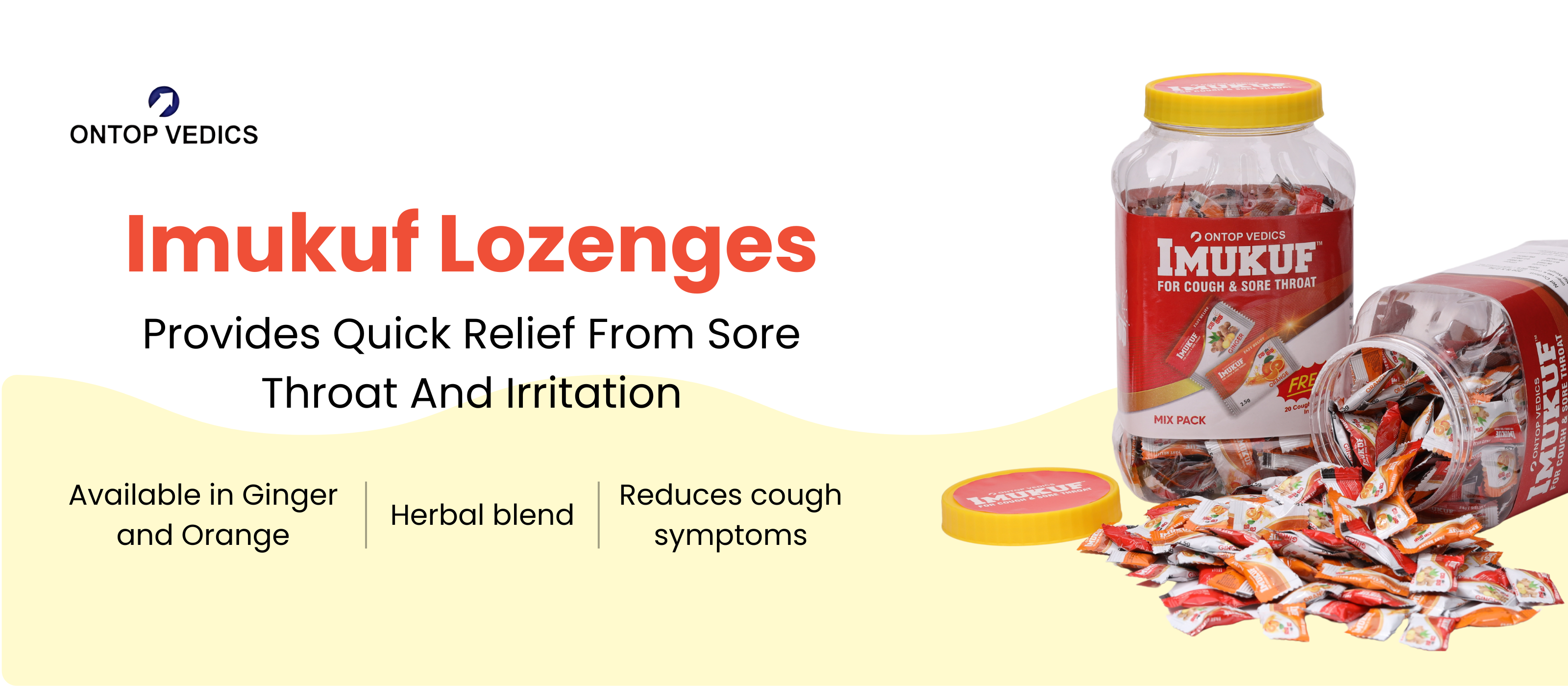 Imukuf Lozenges provide quick relief from sore throat and irritation with a delicious, efficacious formula. This herbal blend features Vasaka, Mulethi, Sunthi, and other soothing herbs, available in Ginger and Orange flavors.